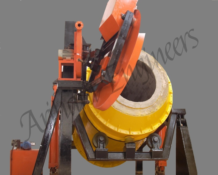 Hot dross from the furnace is collected in to a pan. The pan is shifted to dross processing machine by forklift/crane. Dross processing machine is a modified version of Universal Tilting Rotary Furnace. The major difference is that the door of the furnace is completely flush with the furnace and the door rotates with the furnace.